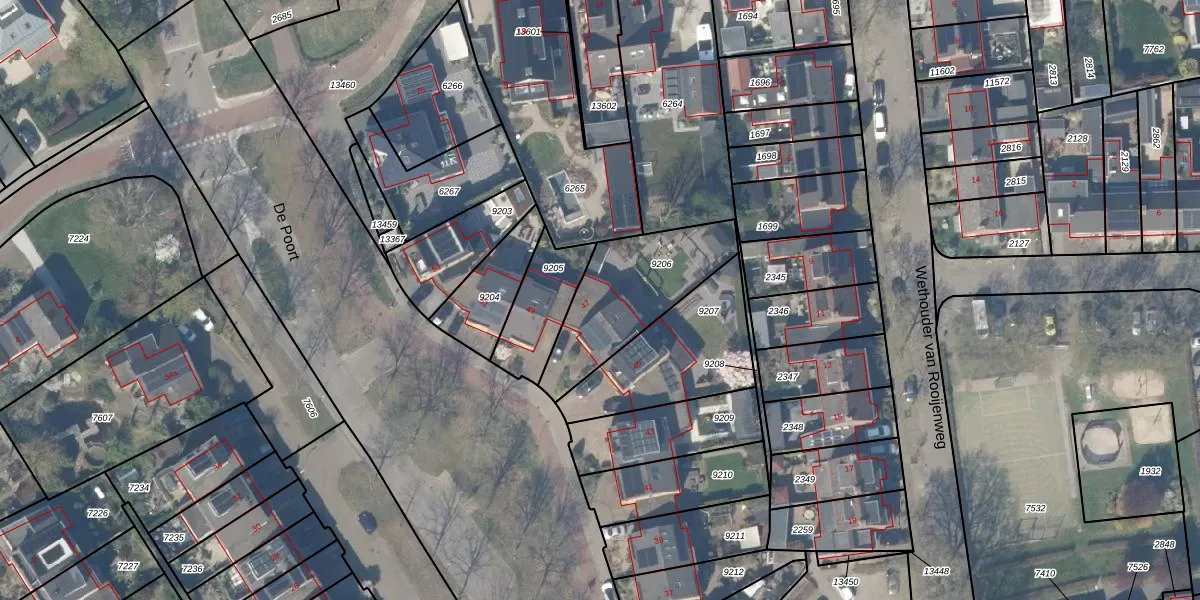 Het perceel waarop De Poort 47 staat heeft een oppervlakte van 437 m². Dit is een groot perceel. De perceeloppervlakte wordt geregistreerd door het Kadaster. Gedetailleerde informatie over de maten van dit perceel kunt u vinden in het rapport Kadastrale kaart met maatvoering van De Poort 47.
