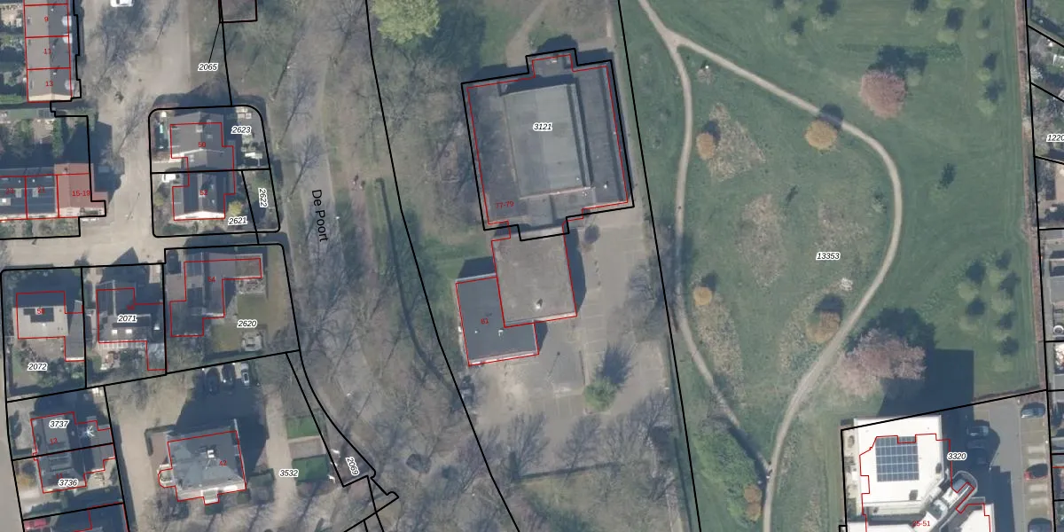 Het perceel waarop De Poort 77 staat heeft een oppervlakte van 5937 m². Dit is een zeer groot perceel. De perceeloppervlakte wordt geregistreerd door het Kadaster. Gedetailleerde informatie over de maten van dit perceel kunt u vinden in het rapport Kadastrale kaart met maatvoering van De Poort 77.