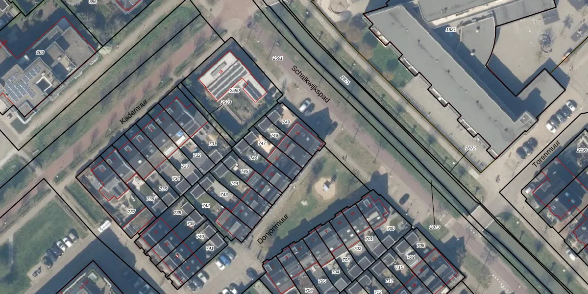 Donjonmuur 14 is gelegen op kadastraal perceel HTN04H748. Deze kadastrale aanduiding is uniek en wordt gebruikt door het Kadaster om eigendomsrechten en andere zakelijke rechten vast te leggen. Het perceel maakt onderdeel uit van de kadastrale gemeente Houten.