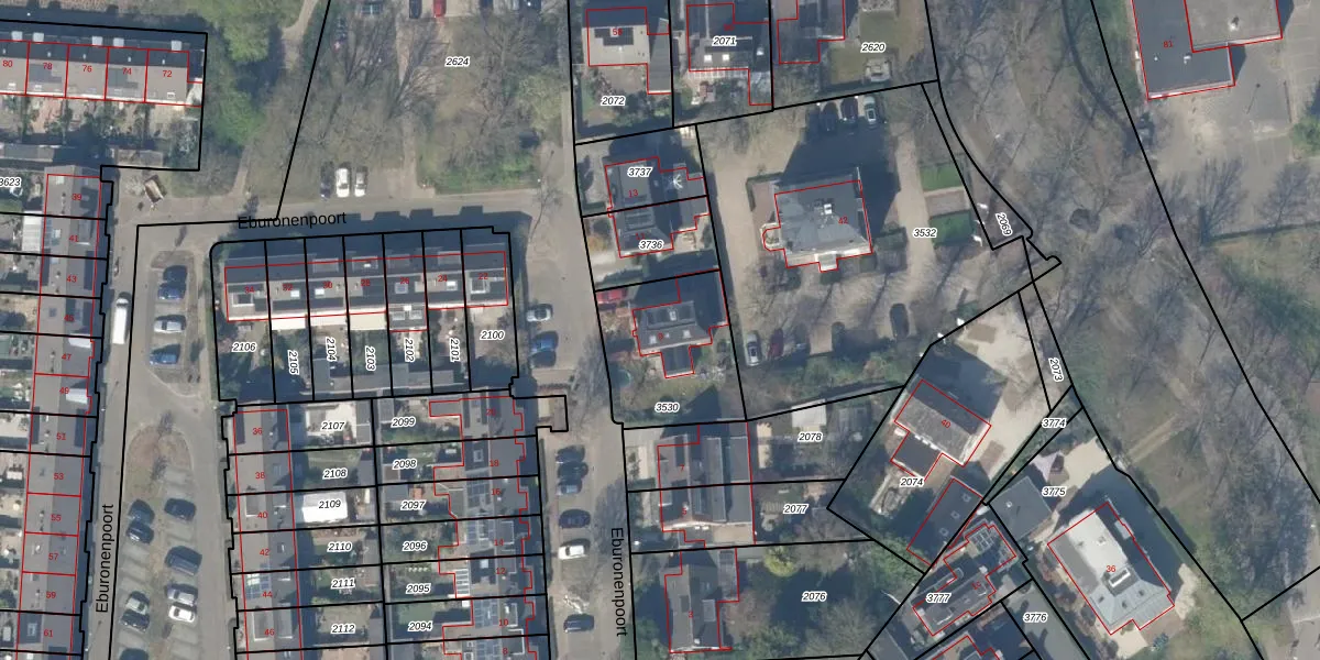Het perceel waarop Eburonenpoort 9 staat heeft een oppervlakte van 430 m². Dit is een groot perceel. De perceeloppervlakte wordt geregistreerd door het Kadaster. Gedetailleerde informatie over de maten van dit perceel kunt u vinden in het rapport Kadastrale kaart met maatvoering van Eburonenpoort 9.
