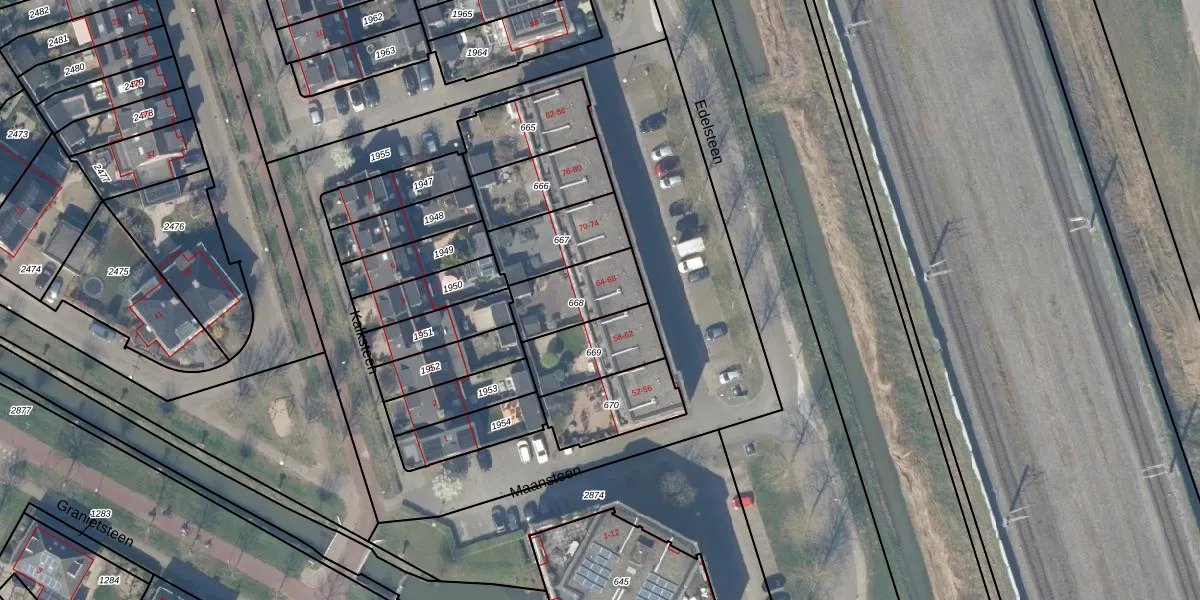 Het perceel waarop Edelsteen 66 staat heeft een oppervlakte van 213 m². Dit is een middelgroot perceel. De perceeloppervlakte wordt geregistreerd door het Kadaster. Gedetailleerde informatie over de maten van dit perceel kunt u vinden in het rapport Kadastrale kaart met maatvoering van Edelsteen 66.