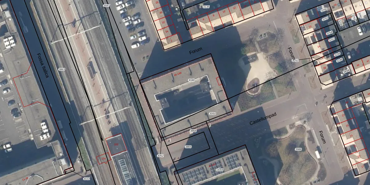 Forum 100 is gelegen op kadastraal perceel HTN04B3048. Deze kadastrale aanduiding is uniek en wordt gebruikt door het Kadaster om eigendomsrechten en andere zakelijke rechten vast te leggen. Het perceel maakt onderdeel uit van de kadastrale gemeente Houten.
