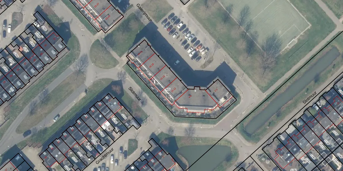 Galerijmuur 12 is gelegen op kadastraal perceel HTN04H445. Deze kadastrale aanduiding is uniek en wordt gebruikt door het Kadaster om eigendomsrechten en andere zakelijke rechten vast te leggen. Het perceel maakt onderdeel uit van de kadastrale gemeente Houten.