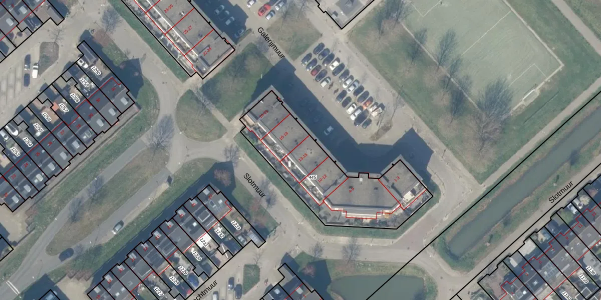 Het perceel waarop Galerijmuur 15 staat heeft een oppervlakte van 1177 m². Dit is een zeer groot perceel. De perceeloppervlakte wordt geregistreerd door het Kadaster. Gedetailleerde informatie over de maten van dit perceel kunt u vinden in het rapport Kadastrale kaart met maatvoering van Galerijmuur 15.