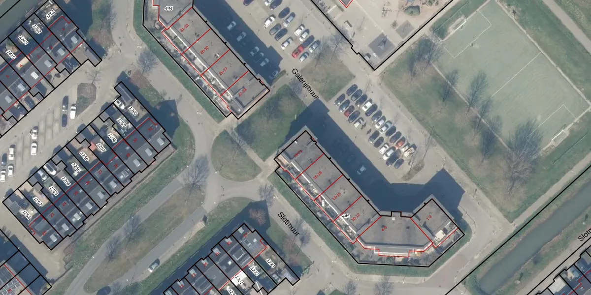 Het perceel waarop Galerijmuur 21 staat heeft een oppervlakte van 1177 m². Dit is een zeer groot perceel. De perceeloppervlakte wordt geregistreerd door het Kadaster. Gedetailleerde informatie over de maten van dit perceel kunt u vinden in het rapport Kadastrale kaart met maatvoering van Galerijmuur 21.