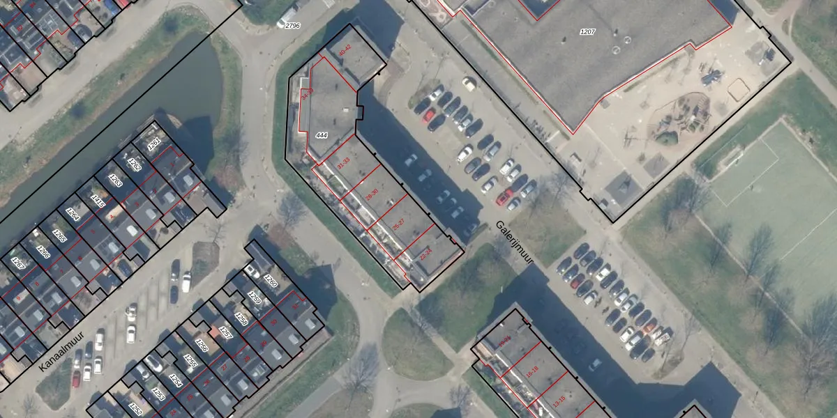 Het perceel waarop Galerijmuur 25 staat heeft een oppervlakte van 1122 m². Dit is een zeer groot perceel. De perceeloppervlakte wordt geregistreerd door het Kadaster. Gedetailleerde informatie over de maten van dit perceel kunt u vinden in het rapport Kadastrale kaart met maatvoering van Galerijmuur 25.