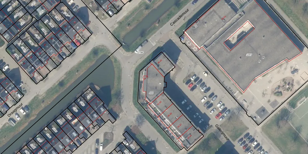 Het perceel waarop Galerijmuur 37 staat heeft een oppervlakte van 1122 m². Dit is een zeer groot perceel. De perceeloppervlakte wordt geregistreerd door het Kadaster. Gedetailleerde informatie over de maten van dit perceel kunt u vinden in het rapport Kadastrale kaart met maatvoering van Galerijmuur 37.