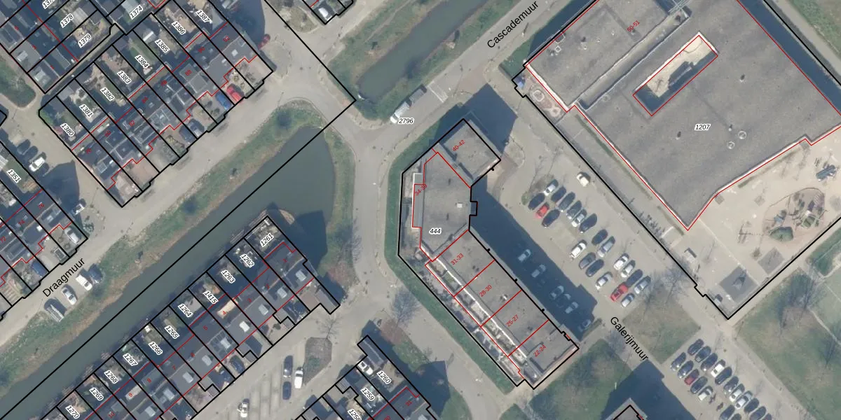 Het perceel waarop Galerijmuur 38 staat heeft een oppervlakte van 1122 m². Dit is een zeer groot perceel. De perceeloppervlakte wordt geregistreerd door het Kadaster. Gedetailleerde informatie over de maten van dit perceel kunt u vinden in het rapport Kadastrale kaart met maatvoering van Galerijmuur 38.
