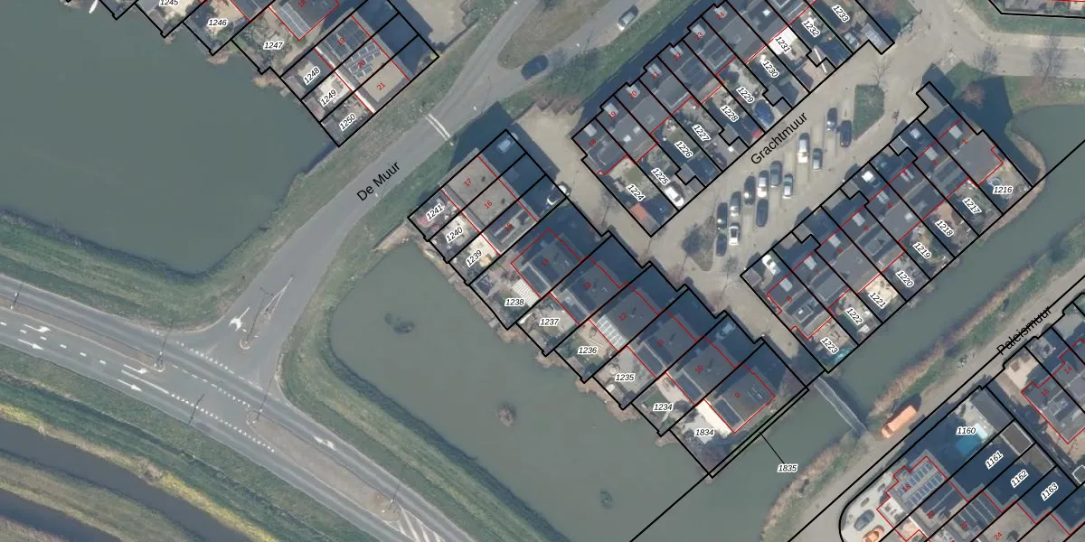 Het perceel waarop Grachtmuur 14 staat heeft een oppervlakte van 265 m². Dit is een middelgroot perceel. De perceeloppervlakte wordt geregistreerd door het Kadaster. Gedetailleerde informatie over de maten van dit perceel kunt u vinden in het rapport Kadastrale kaart met maatvoering van Grachtmuur 14.