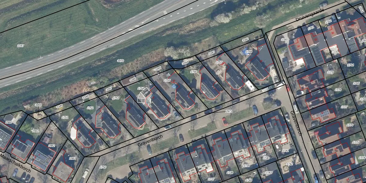 Het perceel waarop Gravenborch 20 staat heeft een oppervlakte van 407 m². Dit is een groot perceel. De perceeloppervlakte wordt geregistreerd door het Kadaster. Gedetailleerde informatie over de maten van dit perceel kunt u vinden in het rapport Kadastrale kaart met maatvoering van Gravenborch 20.