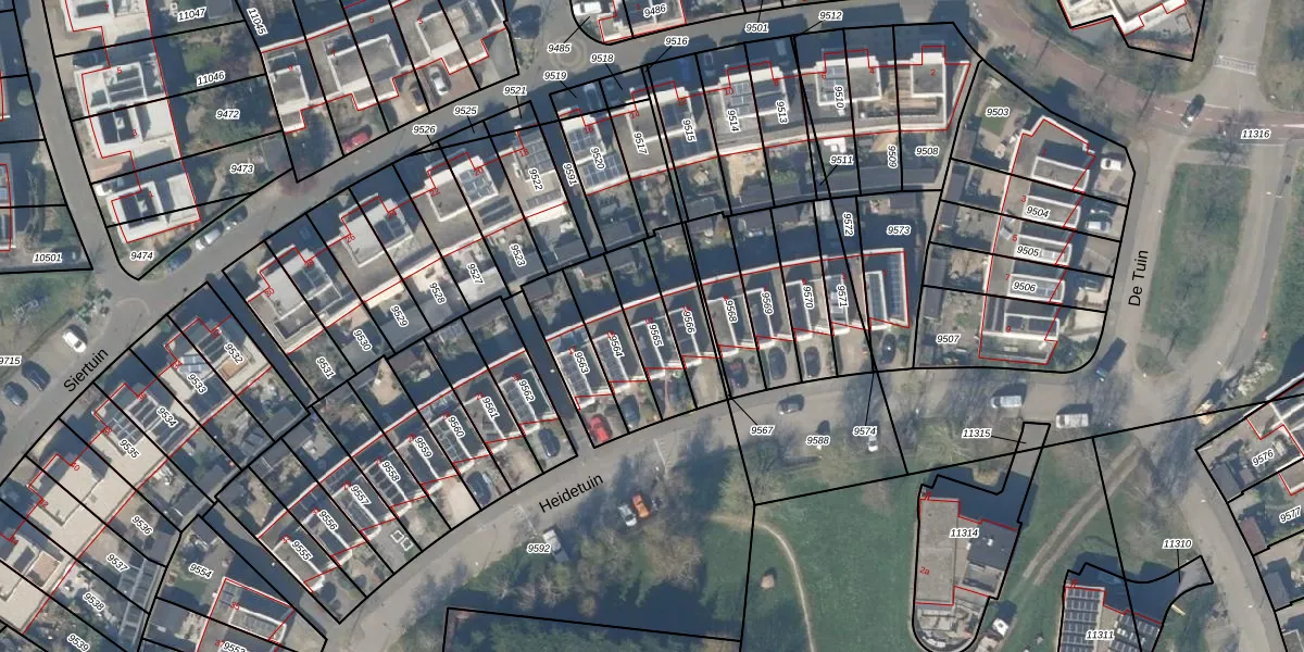 Het perceel waarop Heidetuin 13 staat heeft een oppervlakte van 165 m². Dit is een middelgroot perceel. De perceeloppervlakte wordt geregistreerd door het Kadaster. Gedetailleerde informatie over de maten van dit perceel kunt u vinden in het rapport Kadastrale kaart met maatvoering van Heidetuin 13.