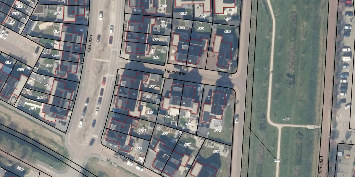 Het perceel waarop Hennegras 1 staat heeft een oppervlakte van 310 m². Dit is een groot perceel. De perceeloppervlakte wordt geregistreerd door het Kadaster. Gedetailleerde informatie over de maten van dit perceel kunt u vinden in het rapport Kadastrale kaart met maatvoering van Hennegras 1.