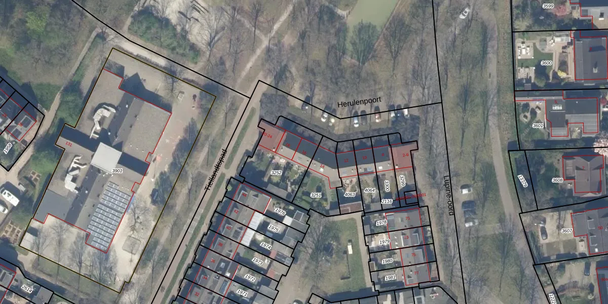 Het perceel waarop Herulenpoort 16 staat heeft een oppervlakte van 452 m². Dit is een groot perceel. De perceeloppervlakte wordt geregistreerd door het Kadaster. Gedetailleerde informatie over de maten van dit perceel kunt u vinden in het rapport Kadastrale kaart met maatvoering van Herulenpoort 16.