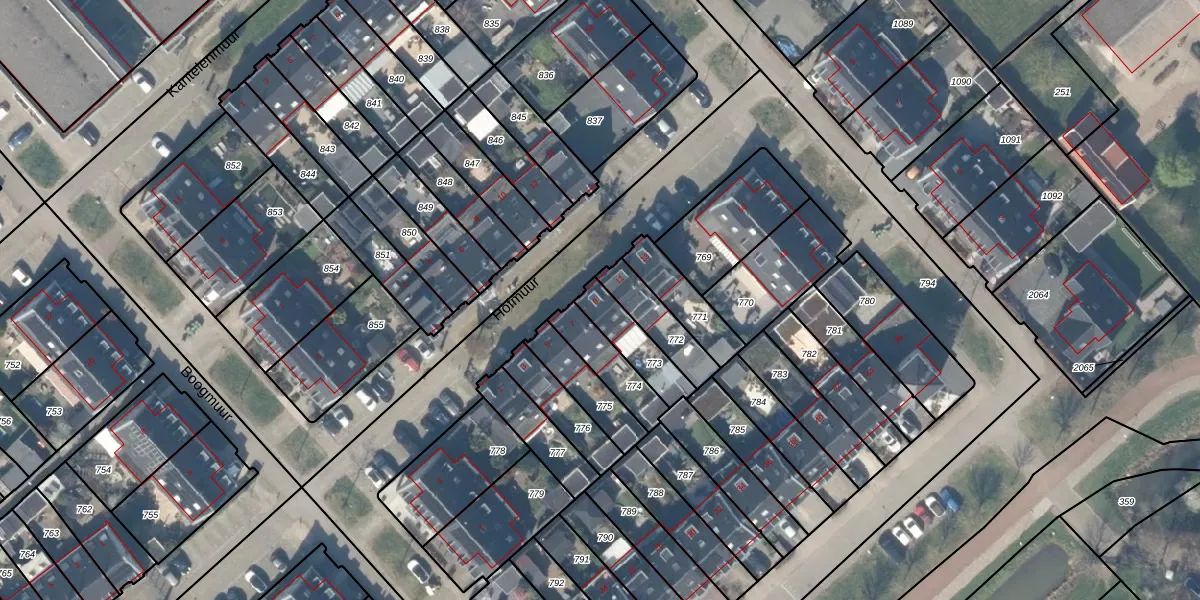 Het perceel waarop Hofmuur 9 staat heeft een oppervlakte van 133 m². Dit is een middelgroot perceel. De perceeloppervlakte wordt geregistreerd door het Kadaster. Gedetailleerde informatie over de maten van dit perceel kunt u vinden in het rapport Kadastrale kaart met maatvoering van Hofmuur 9.