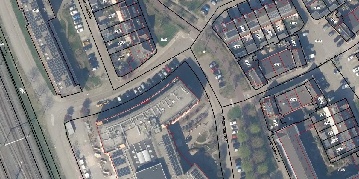 Het perceel waarop Hollandsspoor 1-208 staat heeft een oppervlakte van 8108 m². Dit is een zeer groot perceel. De perceeloppervlakte wordt geregistreerd door het Kadaster. Gedetailleerde informatie over de maten van dit perceel kunt u vinden in het rapport Kadastrale kaart met maatvoering van Hollandsspoor 1-208.