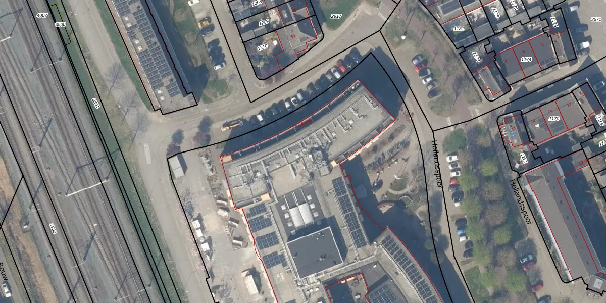 Het perceel waarop Hollandsspoor 1-112 staat heeft een oppervlakte van 8108 m². Dit is een zeer groot perceel. De perceeloppervlakte wordt geregistreerd door het Kadaster. Gedetailleerde informatie over de maten van dit perceel kunt u vinden in het rapport Kadastrale kaart met maatvoering van Hollandsspoor 1-112.