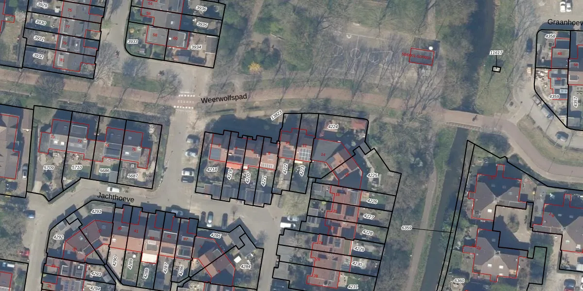 Het perceel waarop Jachthoeve 10 staat heeft een oppervlakte van 165 m². Dit is een middelgroot perceel. De perceeloppervlakte wordt geregistreerd door het Kadaster. Gedetailleerde informatie over de maten van dit perceel kunt u vinden in het rapport Kadastrale kaart met maatvoering van Jachthoeve 10.