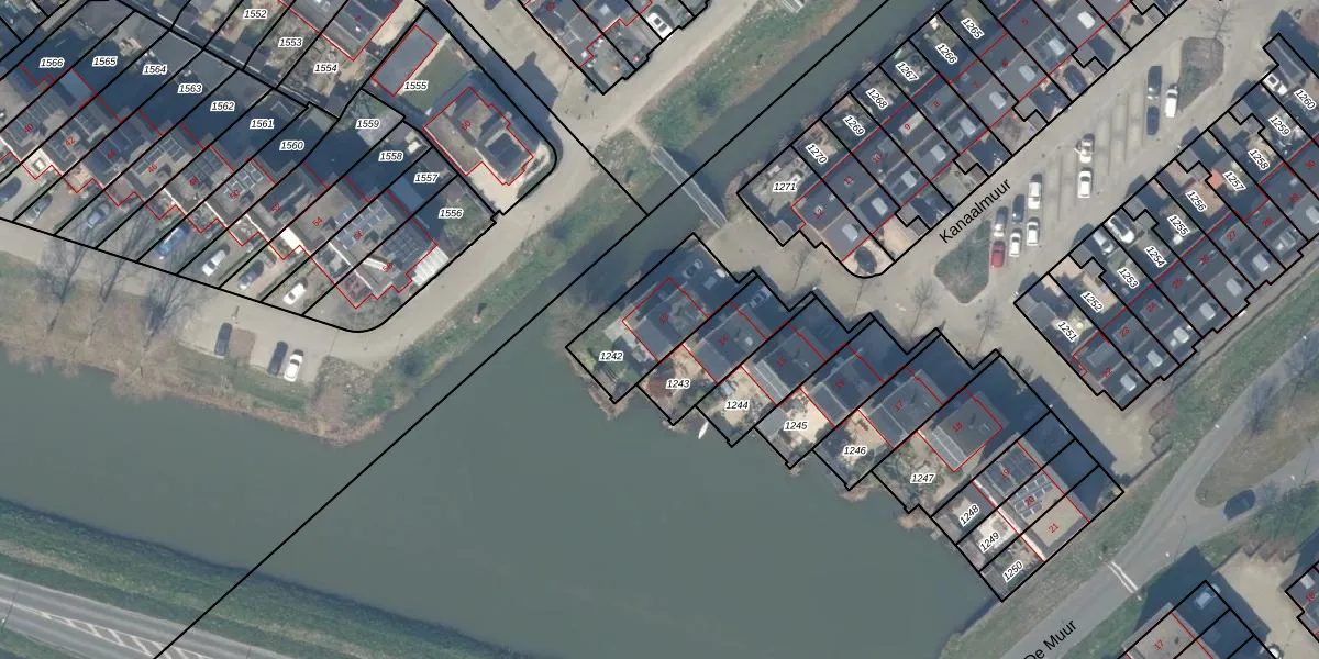 Kanaalmuur 13 is gelegen op kadastraal perceel HTN04H1242. Deze kadastrale aanduiding is uniek en wordt gebruikt door het Kadaster om eigendomsrechten en andere zakelijke rechten vast te leggen. Het perceel maakt onderdeel uit van de kadastrale gemeente Houten.