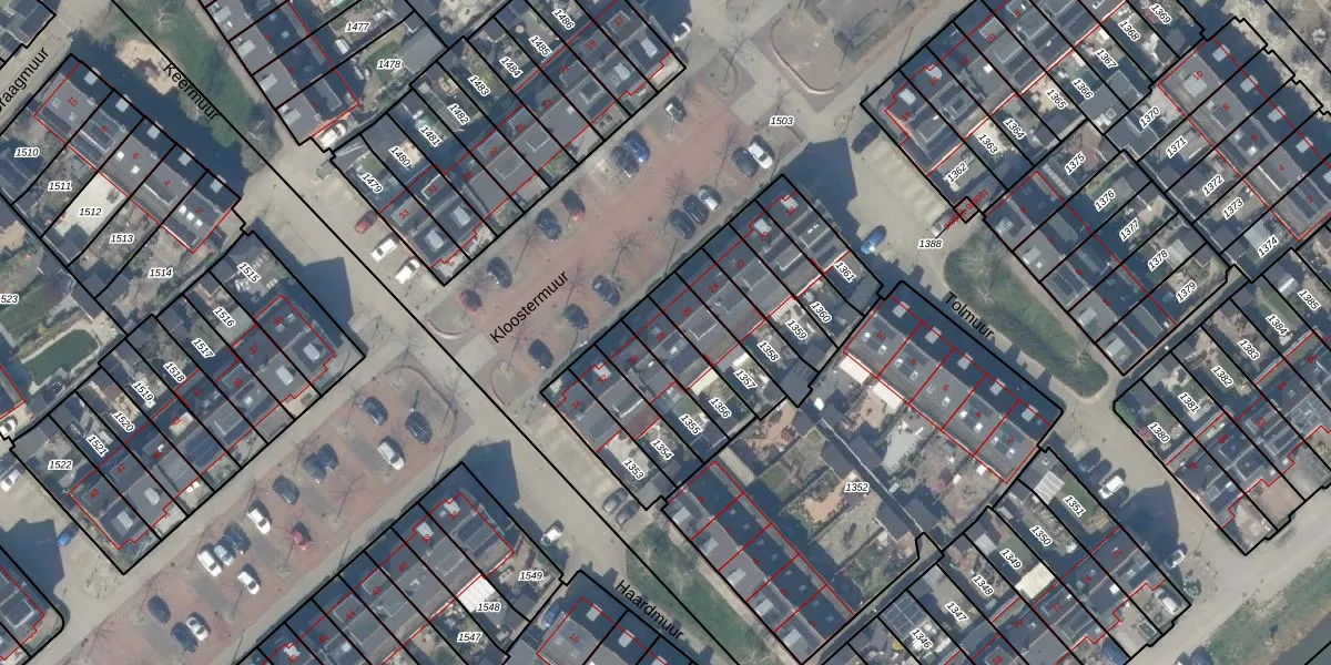 Kloostermuur 28 is gelegen op kadastraal perceel HTN04H1356. Deze kadastrale aanduiding is uniek en wordt gebruikt door het Kadaster om eigendomsrechten en andere zakelijke rechten vast te leggen. Het perceel maakt onderdeel uit van de kadastrale gemeente Houten.