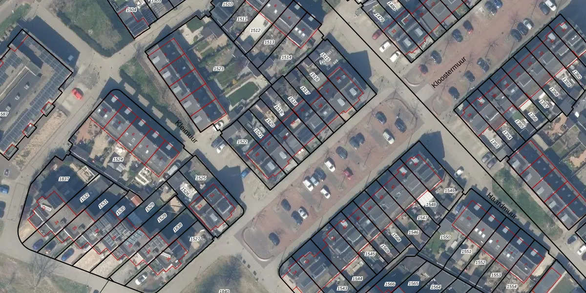 Kloostermuur 45 is gelegen op kadastraal perceel HTN04H1520. Deze kadastrale aanduiding is uniek en wordt gebruikt door het Kadaster om eigendomsrechten en andere zakelijke rechten vast te leggen. Het perceel maakt onderdeel uit van de kadastrale gemeente Houten.