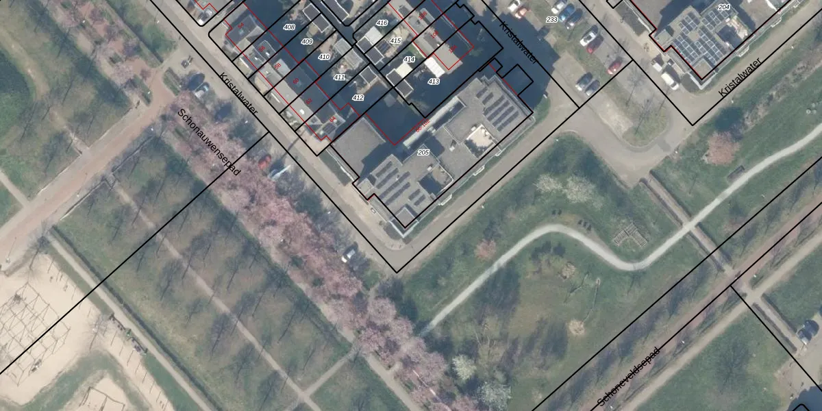Kristalwater 100 is gelegen op kadastraal perceel HTN04H205. Deze kadastrale aanduiding is uniek en wordt gebruikt door het Kadaster om eigendomsrechten en andere zakelijke rechten vast te leggen. Het perceel maakt onderdeel uit van de kadastrale gemeente Houten.