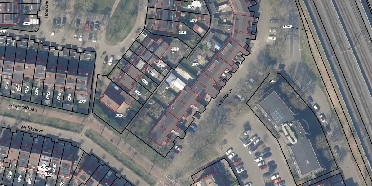 Het perceel waarop Leenhoeve 23 staat heeft een oppervlakte van 2895 m². Dit is een zeer groot perceel. De perceeloppervlakte wordt geregistreerd door het Kadaster. Gedetailleerde informatie over de maten van dit perceel kunt u vinden in het rapport Kadastrale kaart met maatvoering van Leenhoeve 23.