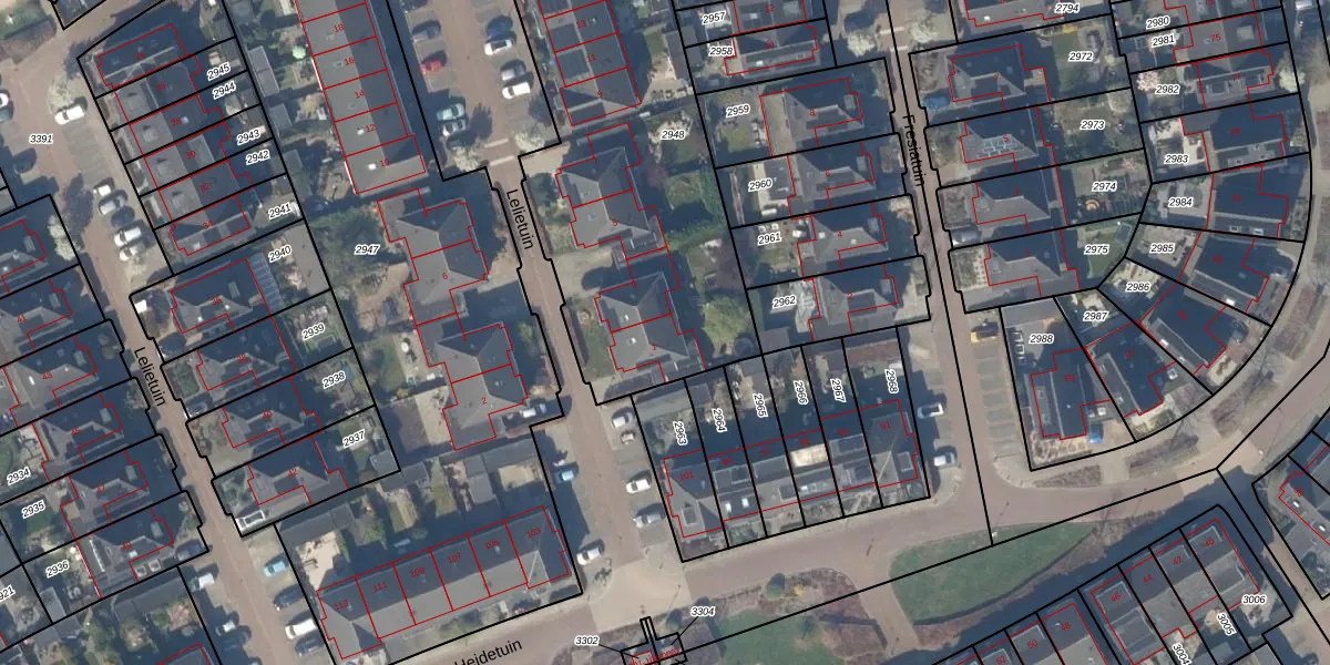 Het perceel waarop Lelietuin 1 staat heeft een oppervlakte van 2043 m². Dit is een zeer groot perceel. De perceeloppervlakte wordt geregistreerd door het Kadaster. Gedetailleerde informatie over de maten van dit perceel kunt u vinden in het rapport Kadastrale kaart met maatvoering van Lelietuin 1.