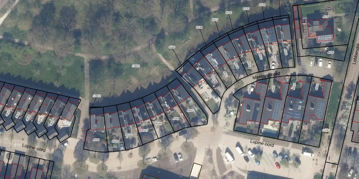 Lupine-oord 1 is gelegen op kadastraal perceel HTN04A4550. Deze kadastrale aanduiding is uniek en wordt gebruikt door het Kadaster om eigendomsrechten en andere zakelijke rechten vast te leggen. Het perceel maakt onderdeel uit van de kadastrale gemeente Houten.