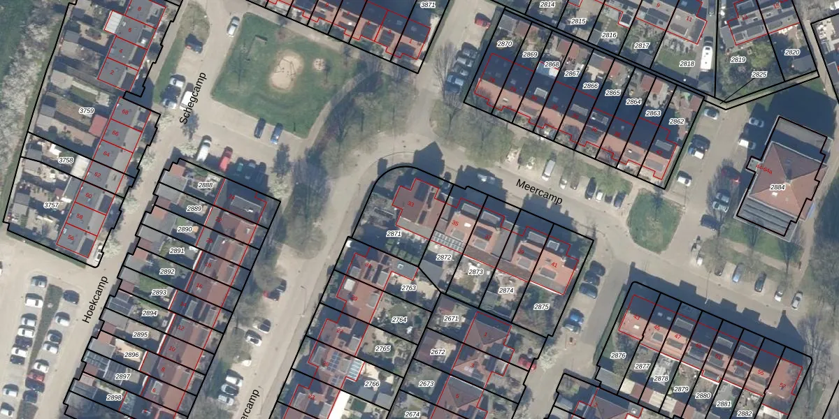 Het perceel waarop Meercamp 33 staat heeft een oppervlakte van 356 m². Dit is een groot perceel. De perceeloppervlakte wordt geregistreerd door het Kadaster. Gedetailleerde informatie over de maten van dit perceel kunt u vinden in het rapport Kadastrale kaart met maatvoering van Meercamp 33.