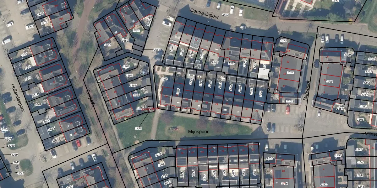 Mijnspoor 35 is gelegen op kadastraal perceel HTN04B1390. Deze kadastrale aanduiding is uniek en wordt gebruikt door het Kadaster om eigendomsrechten en andere zakelijke rechten vast te leggen. Het perceel maakt onderdeel uit van de kadastrale gemeente Houten.