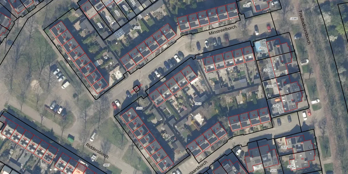 Minstreelborch 5 is gelegen op kadastraal perceel HTN04E1613. Deze kadastrale aanduiding is uniek en wordt gebruikt door het Kadaster om eigendomsrechten en andere zakelijke rechten vast te leggen. Het perceel maakt onderdeel uit van de kadastrale gemeente Houten.