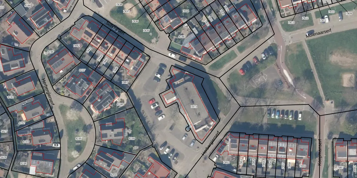 Molenaarserf 82 is gelegen op kadastraal perceel HTN04A7671. Deze kadastrale aanduiding is uniek en wordt gebruikt door het Kadaster om eigendomsrechten en andere zakelijke rechten vast te leggen. Het perceel maakt onderdeel uit van de kadastrale gemeente Houten.