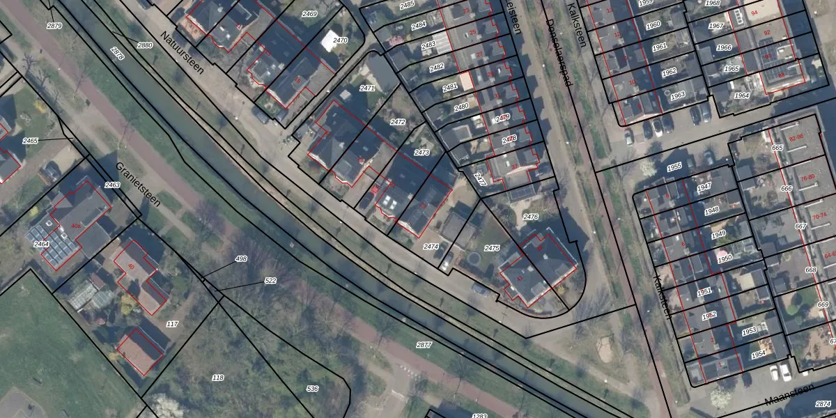 Het perceel waarop Natuursteen 23 staat heeft een oppervlakte van 308 m². Dit is een groot perceel. De perceeloppervlakte wordt geregistreerd door het Kadaster. Gedetailleerde informatie over de maten van dit perceel kunt u vinden in het rapport Kadastrale kaart met maatvoering van Natuursteen 23.