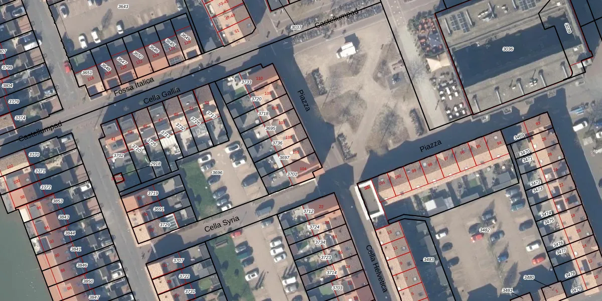 Het perceel waarop Piazza 105 staat heeft een oppervlakte van 107 m². Dit is een middelgroot perceel. De perceeloppervlakte wordt geregistreerd door het Kadaster. Gedetailleerde informatie over de maten van dit perceel kunt u vinden in het rapport Kadastrale kaart met maatvoering van Piazza 105.