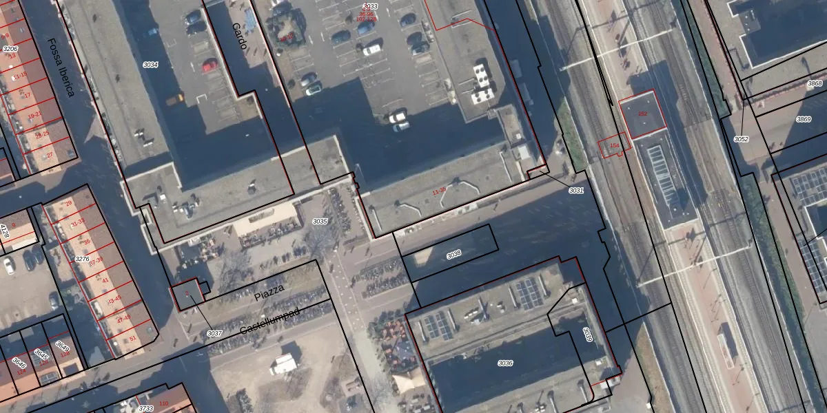 Het perceel waarop Piazza 12 staat heeft een oppervlakte van 5365 m². Dit is een zeer groot perceel. De perceeloppervlakte wordt geregistreerd door het Kadaster. Gedetailleerde informatie over de maten van dit perceel kunt u vinden in het rapport Kadastrale kaart met maatvoering van Piazza 12.