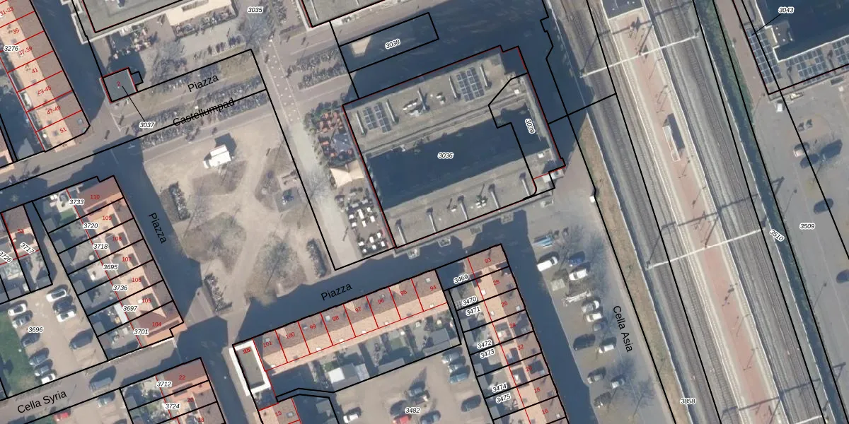 Het perceel waarop Piazza 41 staat heeft een oppervlakte van 1322 m². Dit is een zeer groot perceel. De perceeloppervlakte wordt geregistreerd door het Kadaster. Gedetailleerde informatie over de maten van dit perceel kunt u vinden in het rapport Kadastrale kaart met maatvoering van Piazza 41.