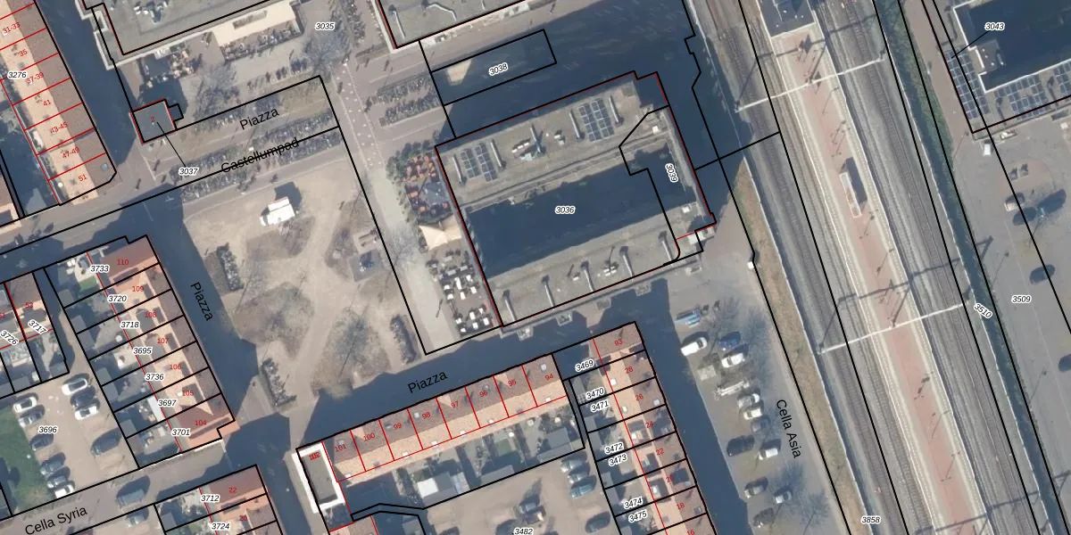 Het perceel waarop Piazza 51 staat heeft een oppervlakte van 1322 m². Dit is een zeer groot perceel. De perceeloppervlakte wordt geregistreerd door het Kadaster. Gedetailleerde informatie over de maten van dit perceel kunt u vinden in het rapport Kadastrale kaart met maatvoering van Piazza 51.