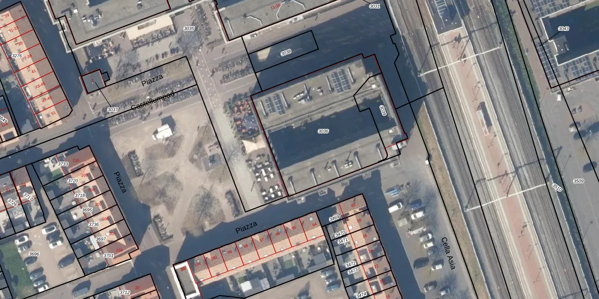 Het perceel waarop Piazza 71 staat heeft een oppervlakte van 1322 m². Dit is een zeer groot perceel. De perceeloppervlakte wordt geregistreerd door het Kadaster. Gedetailleerde informatie over de maten van dit perceel kunt u vinden in het rapport Kadastrale kaart met maatvoering van Piazza 71.