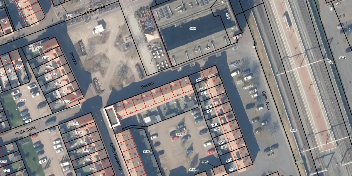 Het perceel waarop Piazza 95 staat heeft een oppervlakte van 1666 m². Dit is een zeer groot perceel. De perceeloppervlakte wordt geregistreerd door het Kadaster. Gedetailleerde informatie over de maten van dit perceel kunt u vinden in het rapport Kadastrale kaart met maatvoering van Piazza 95.