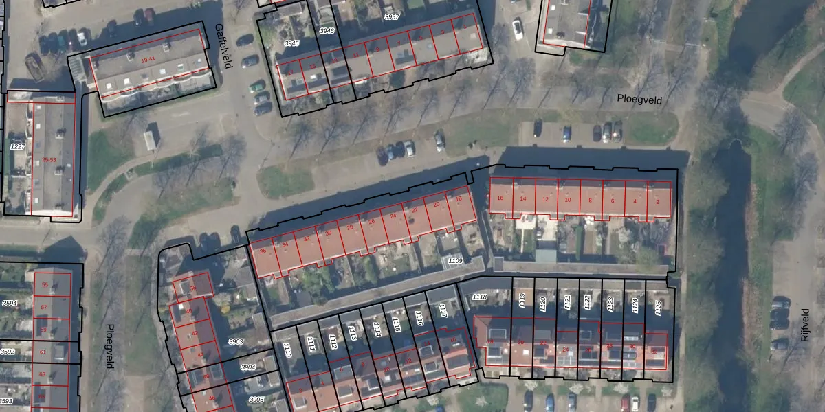 Het perceel waarop Ploegveld 22 staat heeft een oppervlakte van 2655 m². Dit is een zeer groot perceel. De perceeloppervlakte wordt geregistreerd door het Kadaster. Gedetailleerde informatie over de maten van dit perceel kunt u vinden in het rapport Kadastrale kaart met maatvoering van Ploegveld 22.
