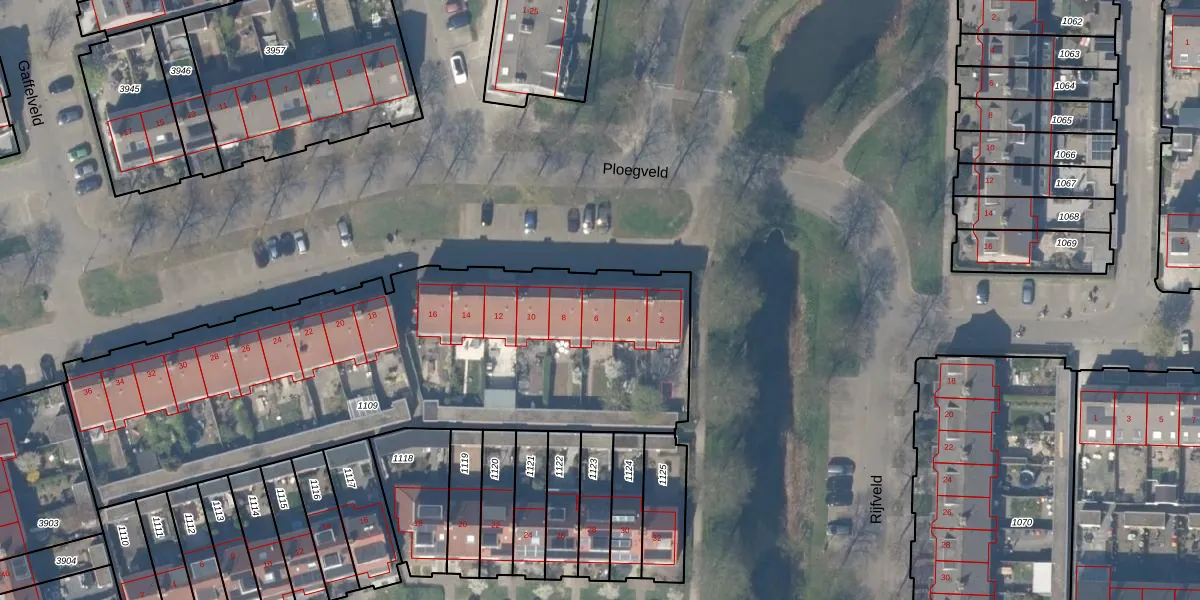 Het perceel waarop Ploegveld 6 staat heeft een oppervlakte van 2655 m². Dit is een zeer groot perceel. De perceeloppervlakte wordt geregistreerd door het Kadaster. Gedetailleerde informatie over de maten van dit perceel kunt u vinden in het rapport Kadastrale kaart met maatvoering van Ploegveld 6.