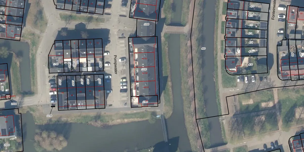 Pompwater 54 is gelegen op kadastraal perceel HTN04H1100. Deze kadastrale aanduiding is uniek en wordt gebruikt door het Kadaster om eigendomsrechten en andere zakelijke rechten vast te leggen. Het perceel maakt onderdeel uit van de kadastrale gemeente Houten.
