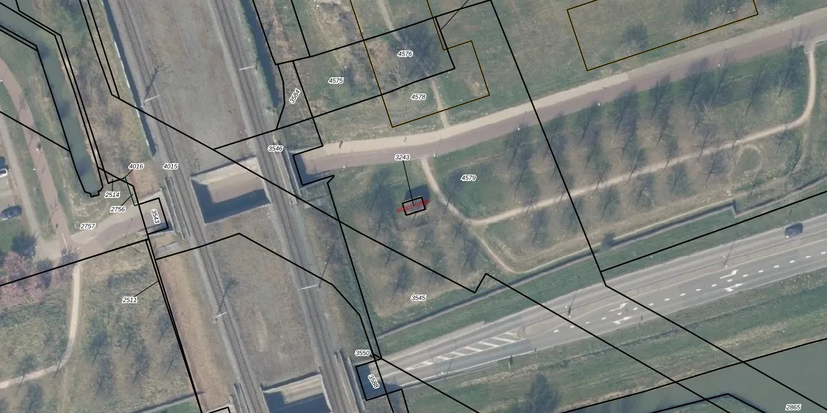 Het adres is gelegen op perceel 3243 in de sectie B en de kadastrale gemeente Houten. De kadastrale aanduiding is aldus HTN04-B-3243. De gemiddelde perceelgrootte in Houten is 2872,58 m². Dit perceel is kleiner: de perceeloppervlakte bedraagt 15 m². Het kleinste perceel in de kadastrale gemeente is 0 m² groot. De grootste perceeloppervlakte is 45,3 ha. Er zijn geen andere adressen aanwezig op het perceel. In de Basisregistratie Kadaster (BRK) werden de grenzen van het perceel geregistreerd op 10-07-2012.