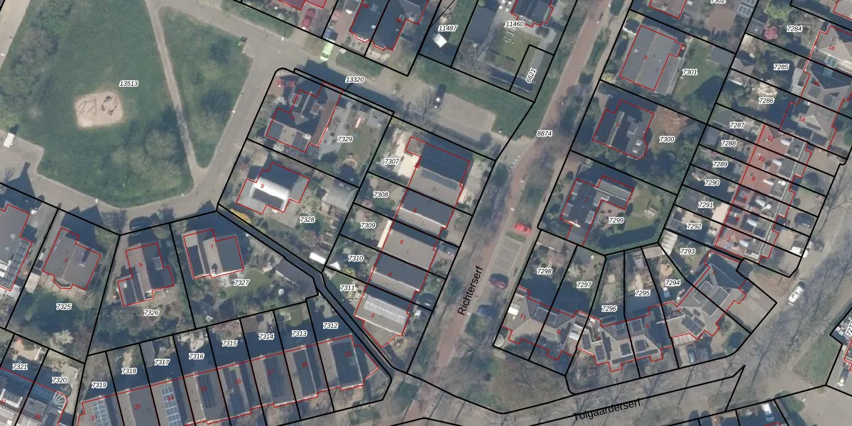 Richterserf 8 is gelegen op kadastraal perceel HTN04A7308. Deze kadastrale aanduiding is uniek en wordt gebruikt door het Kadaster om eigendomsrechten en andere zakelijke rechten vast te leggen. Het perceel maakt onderdeel uit van de kadastrale gemeente Houten.