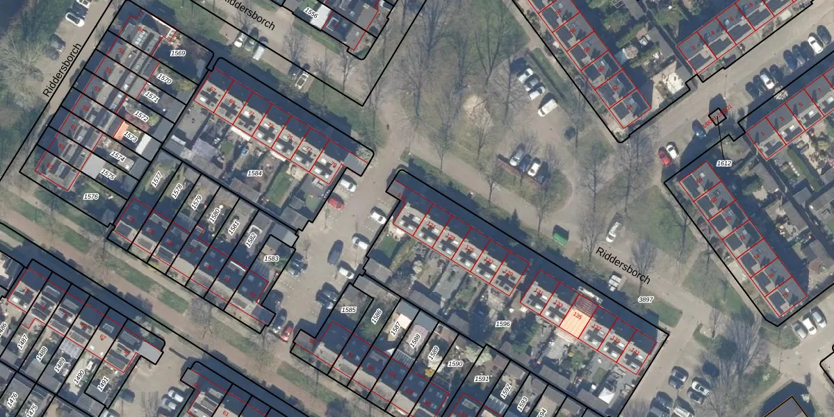 Het perceel waarop Riddersborch 119 staat heeft een oppervlakte van 1845 m². Dit is een zeer groot perceel. De perceeloppervlakte wordt geregistreerd door het Kadaster. Gedetailleerde informatie over de maten van dit perceel kunt u vinden in het rapport Kadastrale kaart met maatvoering van Riddersborch 119.