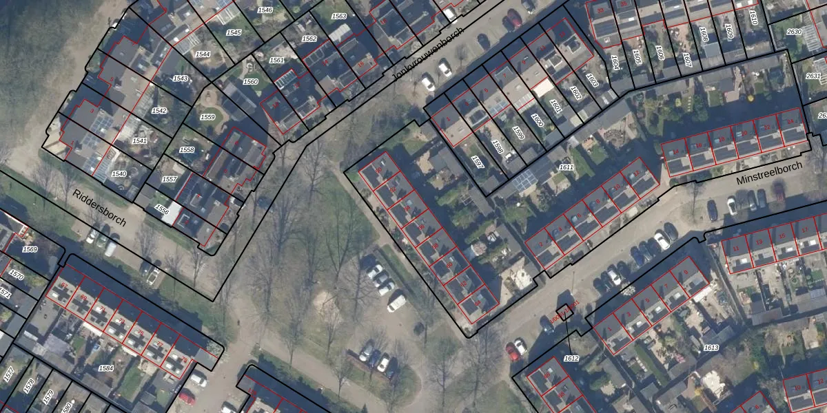 Riddersborch 54 is gelegen op kadastraal perceel HTN04E1611. Deze kadastrale aanduiding is uniek en wordt gebruikt door het Kadaster om eigendomsrechten en andere zakelijke rechten vast te leggen. Het perceel maakt onderdeel uit van de kadastrale gemeente Houten.