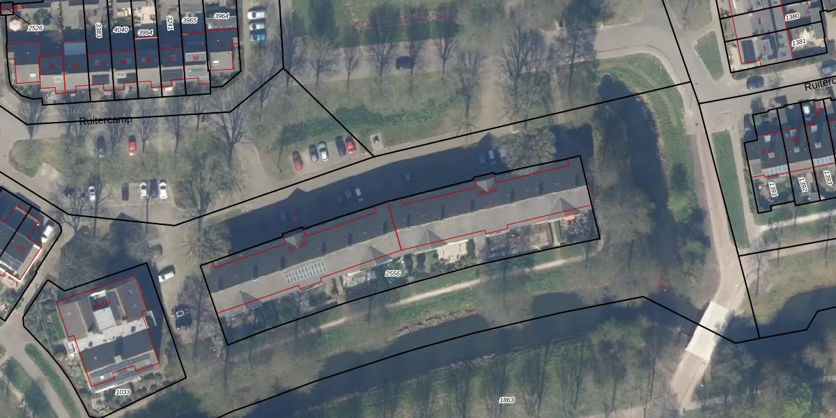 Het perceel waarop Ruitercamp 189 staat heeft een oppervlakte van 1880 m². Dit is een zeer groot perceel. De perceeloppervlakte wordt geregistreerd door het Kadaster. Gedetailleerde informatie over de maten van dit perceel kunt u vinden in het rapport Kadastrale kaart met maatvoering van Ruitercamp 189.