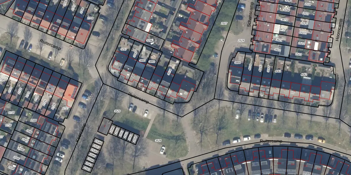 Het perceel waarop Ruitercamp 62 staat heeft een oppervlakte van 2769 m². Dit is een zeer groot perceel. De perceeloppervlakte wordt geregistreerd door het Kadaster. Gedetailleerde informatie over de maten van dit perceel kunt u vinden in het rapport Kadastrale kaart met maatvoering van Ruitercamp 62.