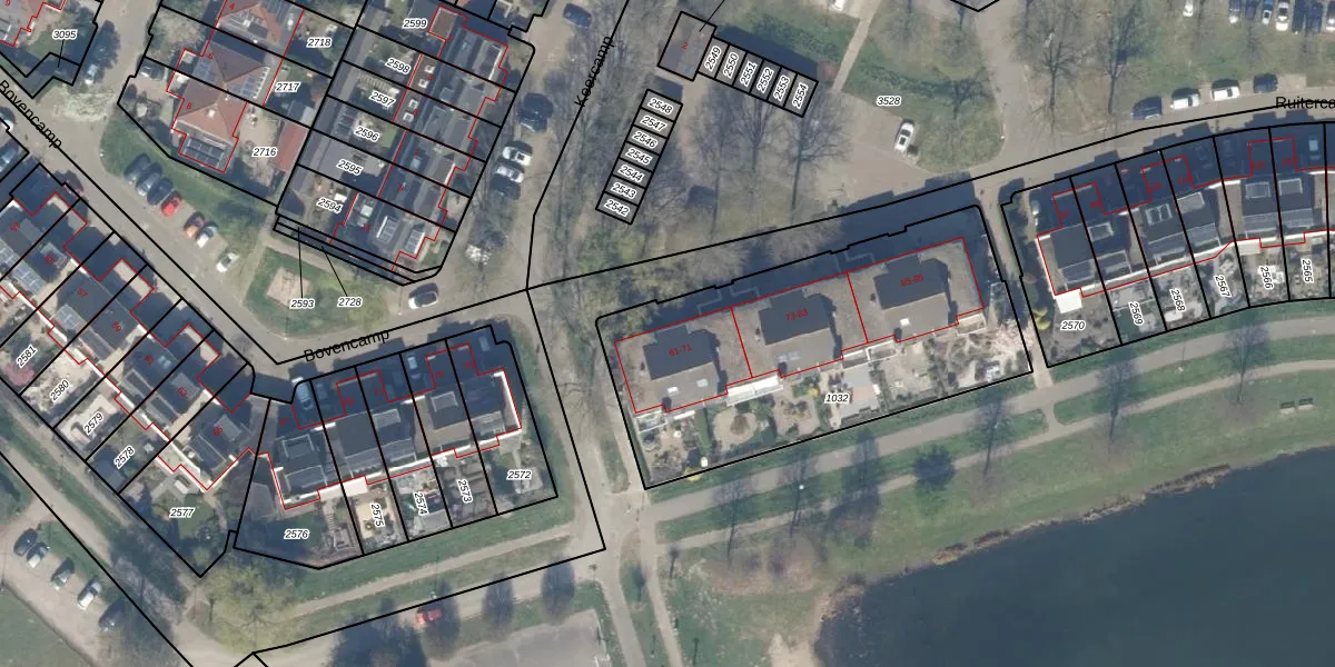 Het perceel waarop Ruitercamp 65 staat heeft een oppervlakte van 1580 m². Dit is een zeer groot perceel. De perceeloppervlakte wordt geregistreerd door het Kadaster. Gedetailleerde informatie over de maten van dit perceel kunt u vinden in het rapport Kadastrale kaart met maatvoering van Ruitercamp 65.
