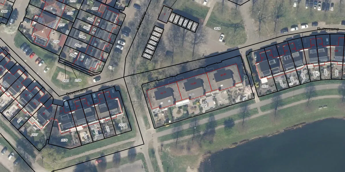 Het perceel waarop Ruitercamp 71 staat heeft een oppervlakte van 1580 m². Dit is een zeer groot perceel. De perceeloppervlakte wordt geregistreerd door het Kadaster. Gedetailleerde informatie over de maten van dit perceel kunt u vinden in het rapport Kadastrale kaart met maatvoering van Ruitercamp 71.